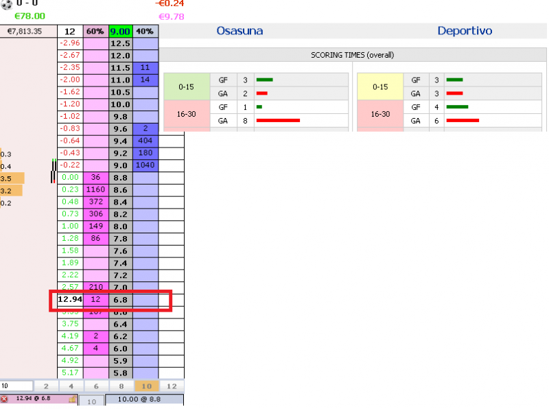 Hoy veo una oportunidad en el Osasuna-Deportivo, partido con tendencia under 2,5, y ambos equipos no marcan ni encajan muchos goles durante los primeros 15 minutos, voy a entrar a 8.8 y salir a 6.8, el beneficio será de unos 2,5 euros (arriesgando 10), luego necesito 5 apuestas buenas para igualar una mala, por ello es una estrategía donde hay que filtrar muy bien los partidos.